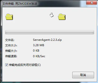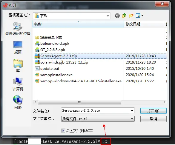 弹出如下框,选择下载好的ServerAgent-2.2.3.zip,勾选底部的□发送文件到ASCII