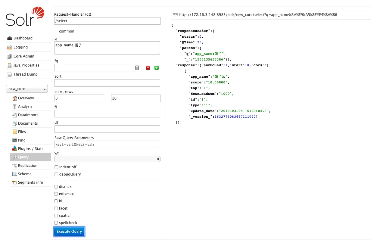 q 查询的关键字,此参数最为重要,例如,q=id:1,默认为q=*:*,