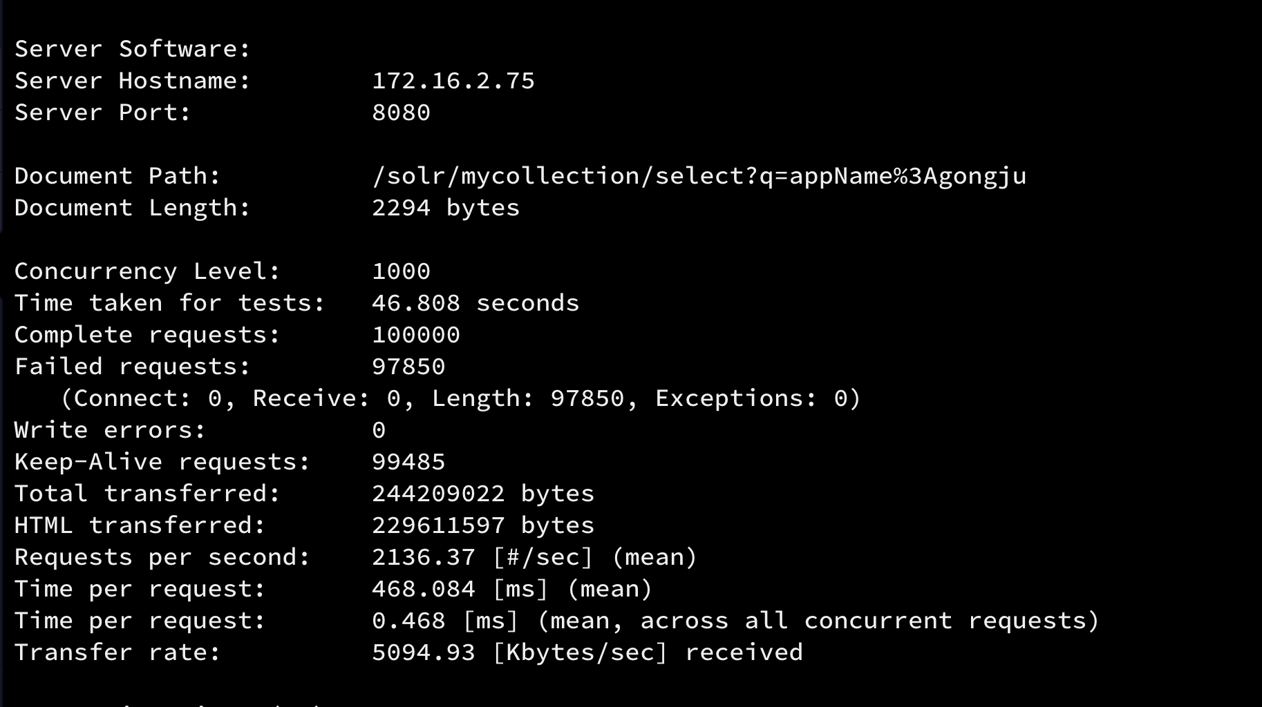 > ab -c 1000 -n 100000 -k "http://solr-1:8080/solr/mycollection/select?q=appName%3Agongju"