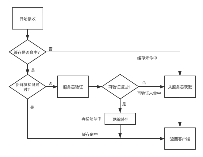 对于服务端而言,已缓存的文档A可能会出现3个情形:1.文档A不变;2.文档A变化了;2.文档A被删除了。当一个带有缓存验证相关的请求头:If-Modified-Since的get类型的http请求达到服务端时,会相应地出现以下3个情形:- 再验证命中:从缓存读取文档A,返回304 Not Modified