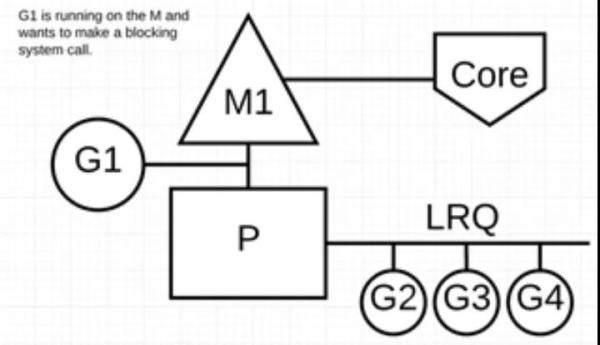 让我们来看看同步系统调用(如文件 I/O)会导致 M 阻塞的情况:G1 将进行同步系统调用以阻塞 M1。