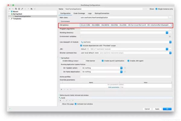$ java -jar -XX:MetaspaceSize=128m -XX:MaxMetaspaceSize=128m -Xms1024m -Xmx1024m -Xmn256m -Xss256k -XX:SurvivorRatio=8 -XX:+UseConcMarkSweepGC newframe-1.0.0.jar