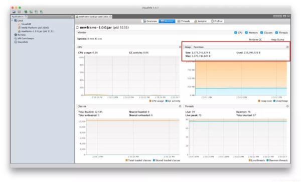 这个时候你再看监控,就会发现已经 OK 了。堆栈都是按照启动时候设置的 JVM 参数启动的。