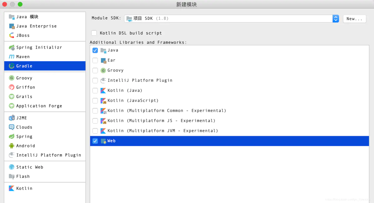 2.1 右键spring源码根目录,新建模块,弹出窗口选择Gradle --> 同时勾选java和web