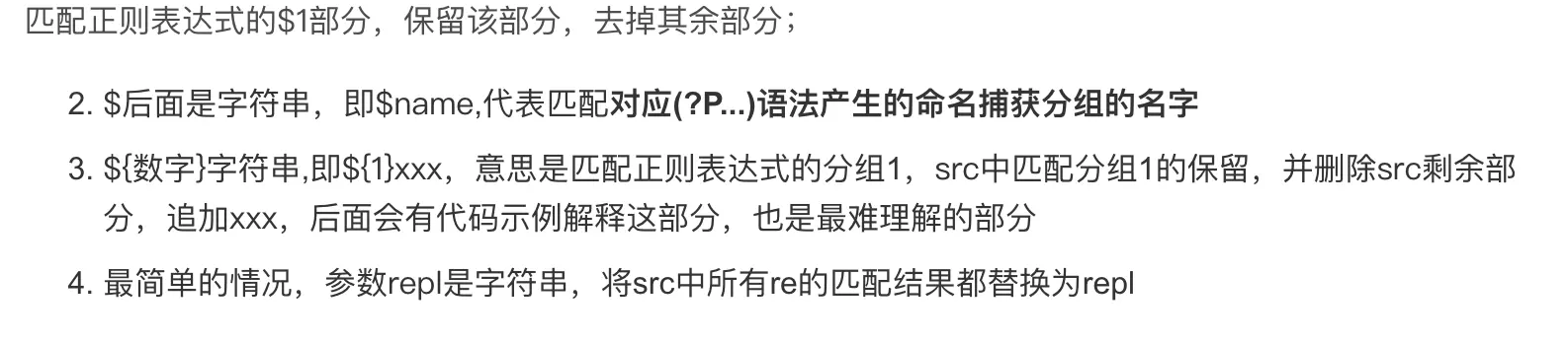 $name或${name}的字符串,其中name是长度>0的字母、数字和下划线的序列。一个单纯的数字字符名如$1会作为捕获分组的数字索引;其他的名字对应(?P...)语法产生的命名捕获分组的名字。超出范围的数字索引、索引对应的分组未匹配到文本、正则表达式中未出现的分组名,都会被替换为空切片。