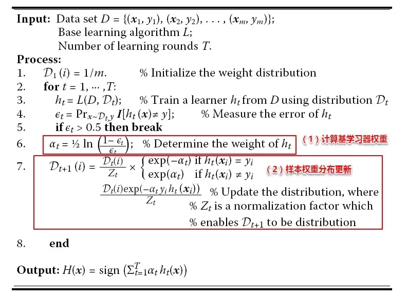可以看出:AdaBoost的核心步骤就是计算基学习器权重和样本权重分布,那为何是上述的计算公式呢?这就涉及到了我们之前为什么说大部分带参机器学习算法只是改变了损失函数,就是因为大部分模型的参数都是通过最优化损失函数(可能还加个规则项)而计算(梯度下降,坐标下降等)得到,这里正是通过最优化指数损失函数从而得到这两个参数的计算公式,具体的推导过程此处不进行展开。