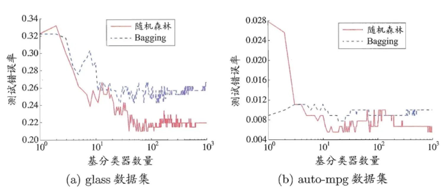 这样随机森林中基学习器的多样性不仅来自样本扰动,还来自属性扰动,从而进一步提升了基学习器之间的差异度。相比决策树的Bagging集成,随机森林的起始性能较差(由于属性扰动,基决策树的准确度有所下降),但随着基学习器数目的增多,随机森林往往会收敛到更低的泛化误差。同时不同于Bagging中决策树从所有属性集中选择最优划分属性,随机森林只在属性集的一个子集中选择划分属性,因此训练效率更高。