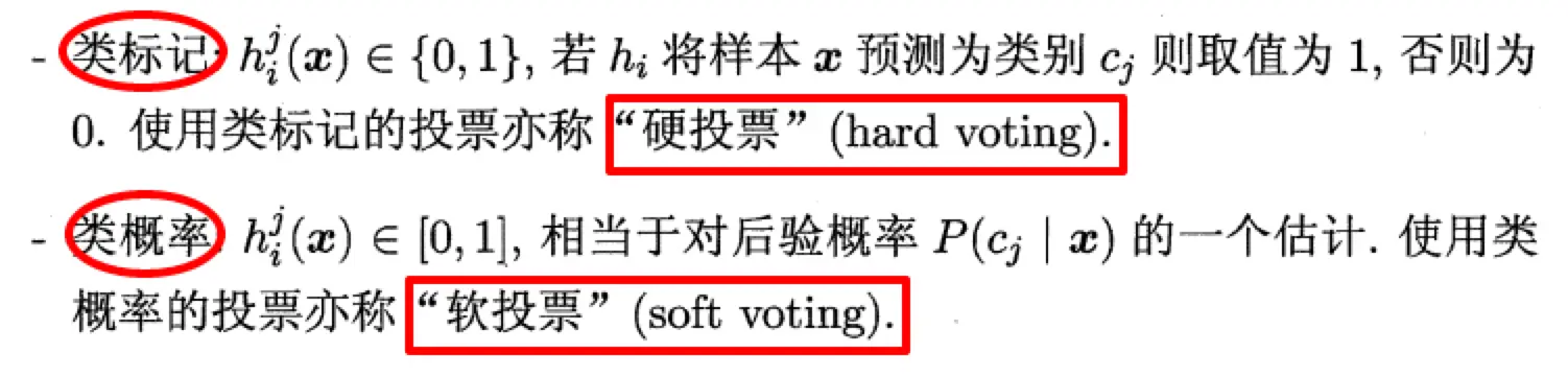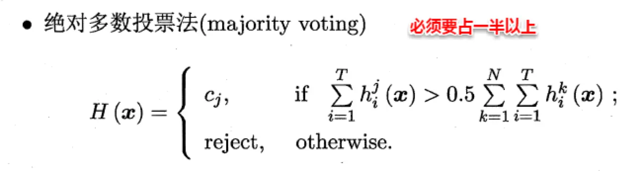 绝对多数投票法(majority voting)提供了拒绝选项,这在可靠性要求很高的学习任务中是一个很好的机制。同时,对于分类任务,各个基学习器的输出值有两种类型,分别为类标记和类概率。