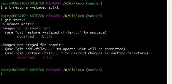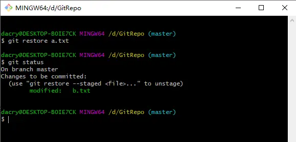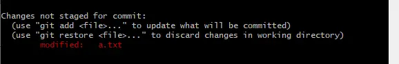 这个命令有点儿奇怪,但是起作用了。a.txt文件已经是修改未暂存的状态了