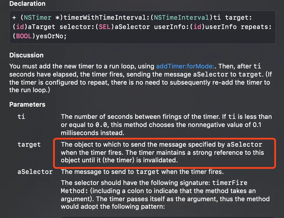 SSTimer *timer = [[SSTimer alloc] initWithTimeInterval:0 interval:ti target:aTarget selector:aSelector userInfo:userInfo repeats:yesOrNo];