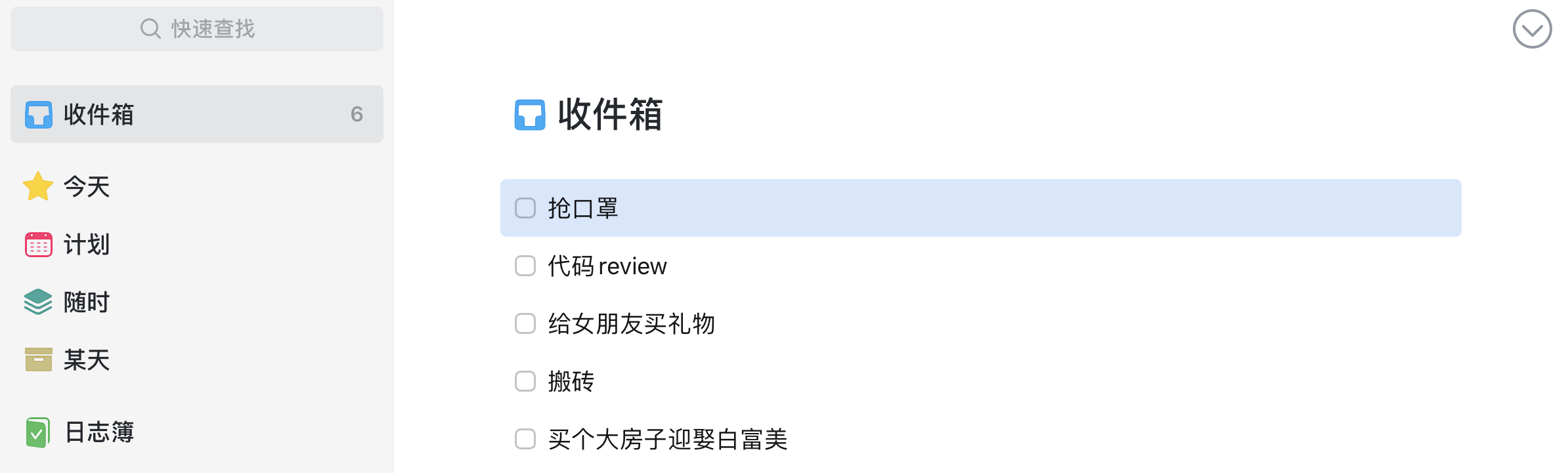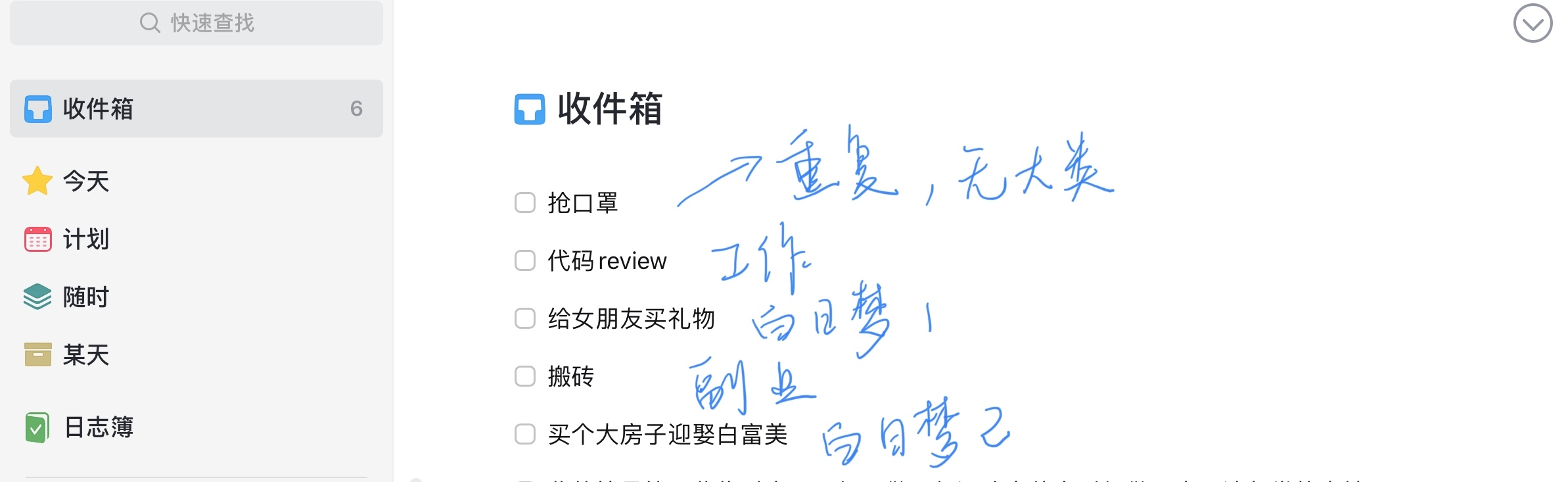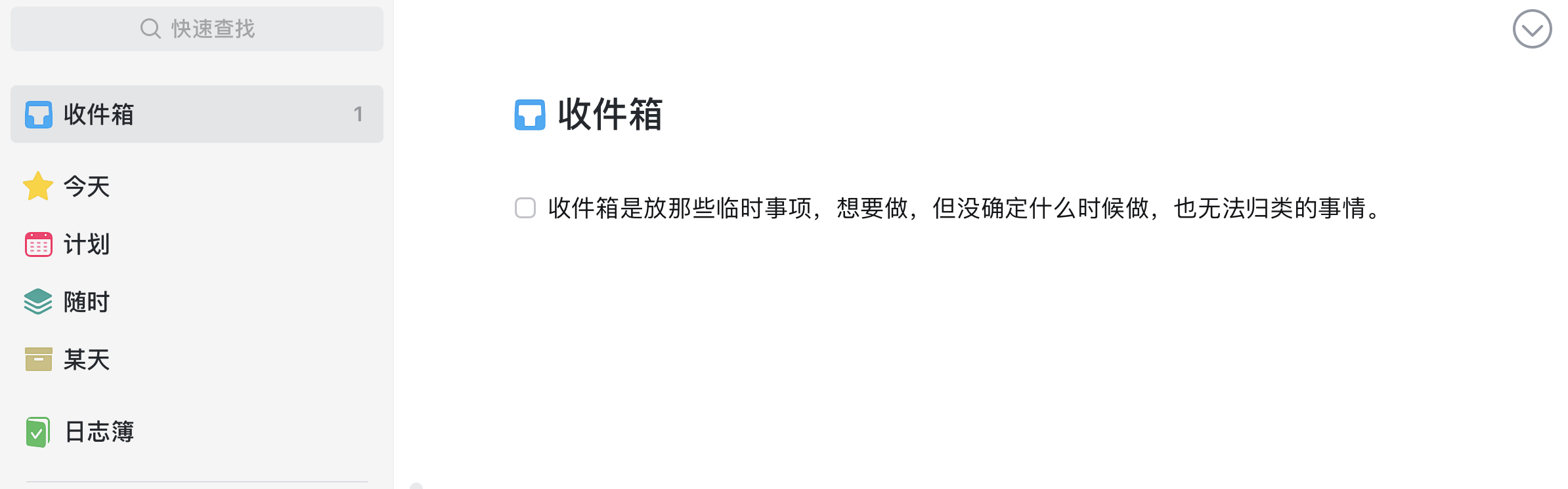 收件箱:就是用来存放临时任务,你可以把大类不明,时间计划不明的任务统一放在这里。