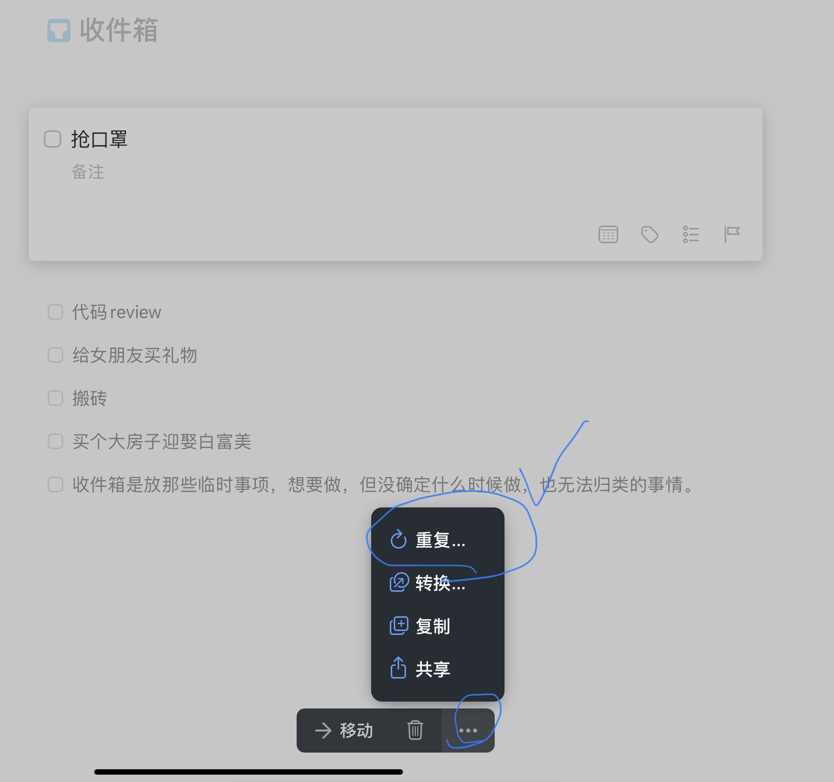 然后你就会发现它消失了!没错,上面说了,收件箱是放那没有固定时间的任务,每天执行的任务会自动跑到 "今天"中
