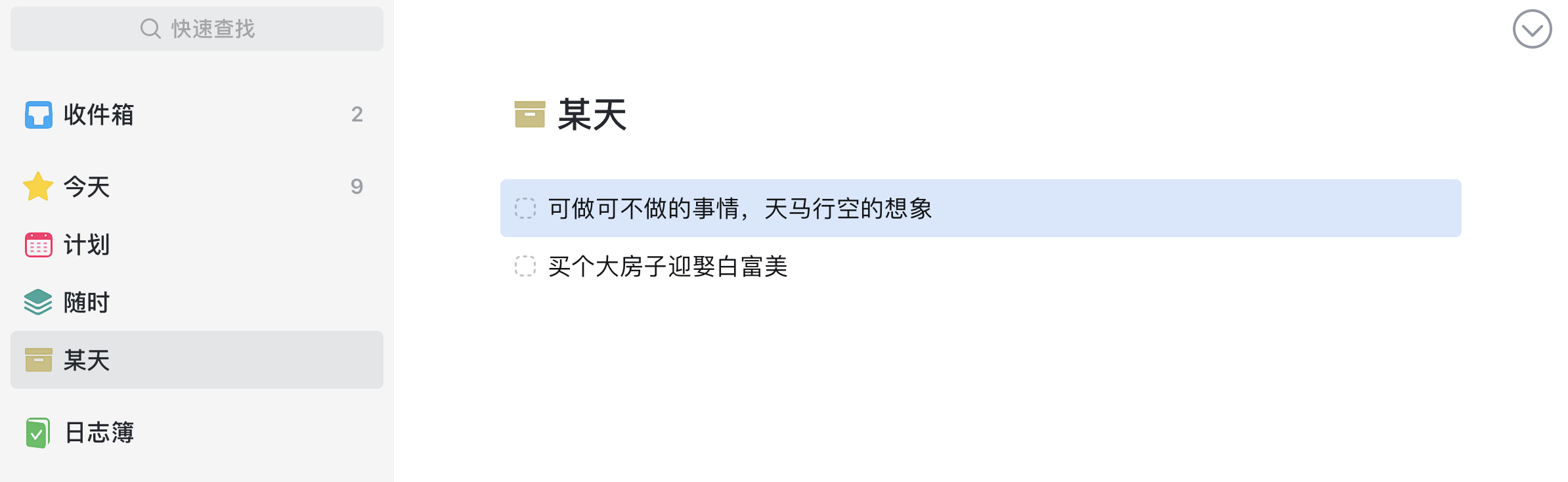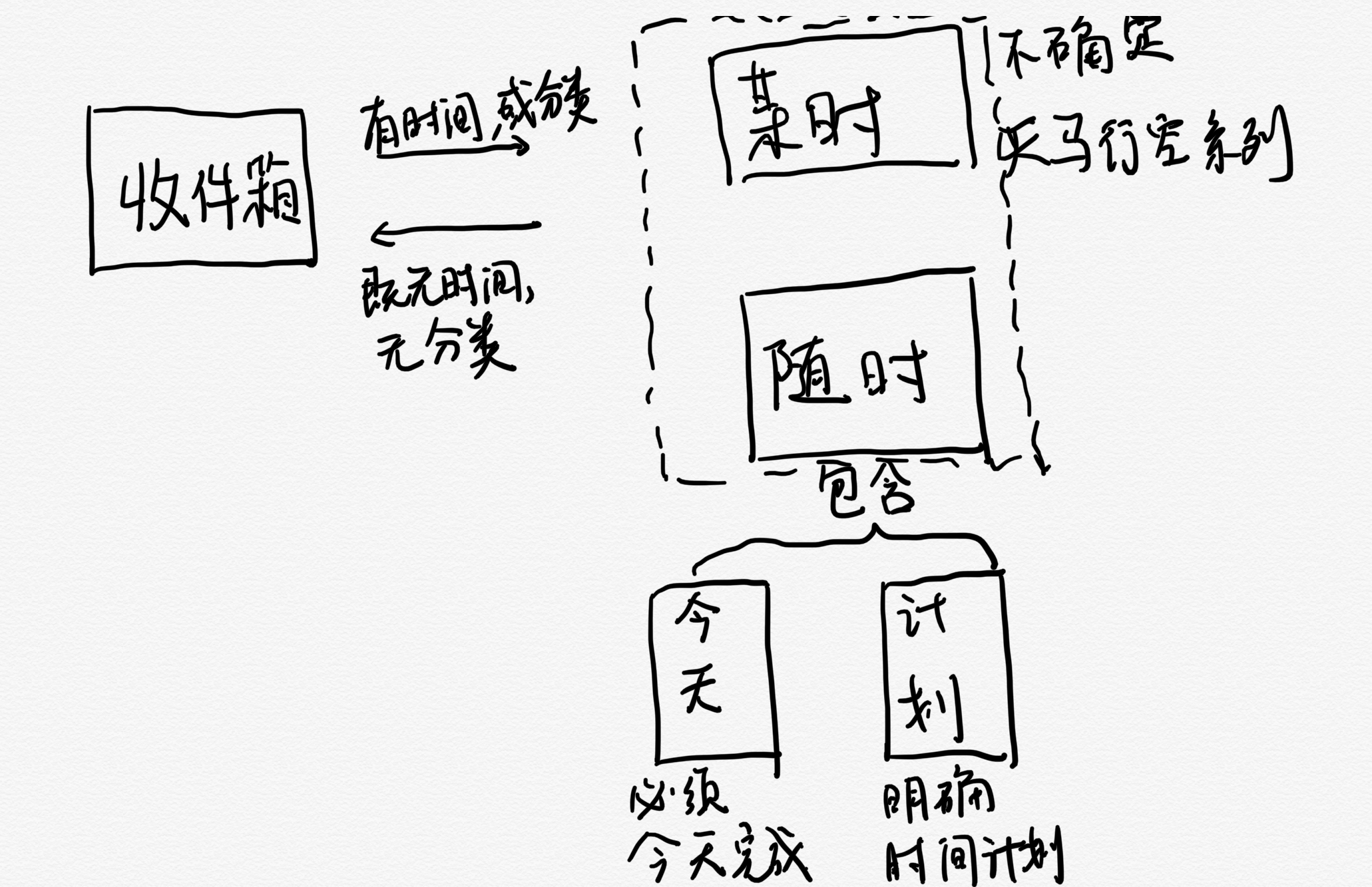 "某时" 通常是指一些天马心空的任务,没有明确时间计划的,或者因为日程太满无法排期的任务。这类任务具有不明确性。和"收件箱"相比,优先级更低。