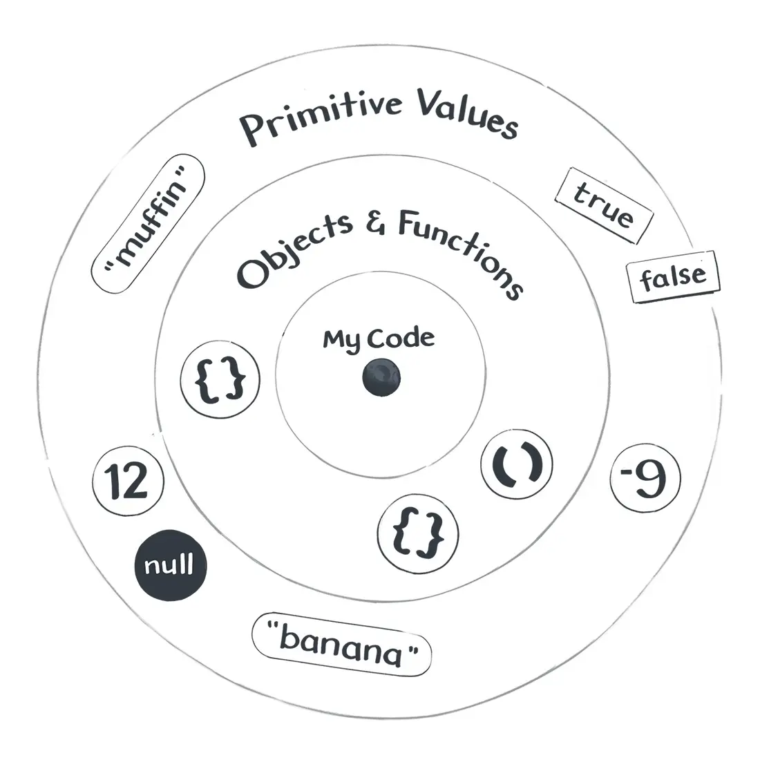 - **先有值,后有万物。**我们可以将值视为在 JavaScript 宇宙中「漂浮」的不同事物。它们不存在于我们的代码之内,但是我们可以在我们的代码中引用它们。