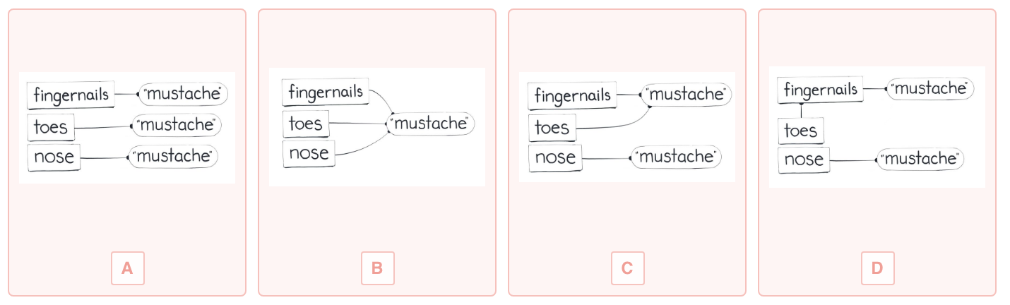 其他的图像都不符合我们的思维模型,因为它们表示出了不止一个 `"mustache"` 字符串值。在我们的宇宙中,每个字符串都只有一个存在。