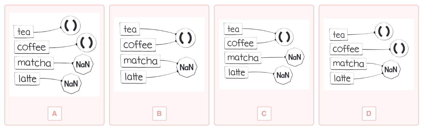 tea和coffee指向两个不同的函数值,而matcha和latte指向同个NaN值。图 A 错误。因为它表示
