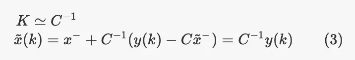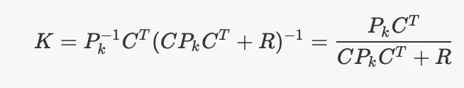 其中$P_k$,当前估算状态的协方差(我们对估算的信心程度)C是测量模型的线性变换,其中y(k) = Cx(k)和R是测量噪声的协方差矩阵。请注意,分数符号并不是真正正确的,但是可以使发生的事情更容易可视化。