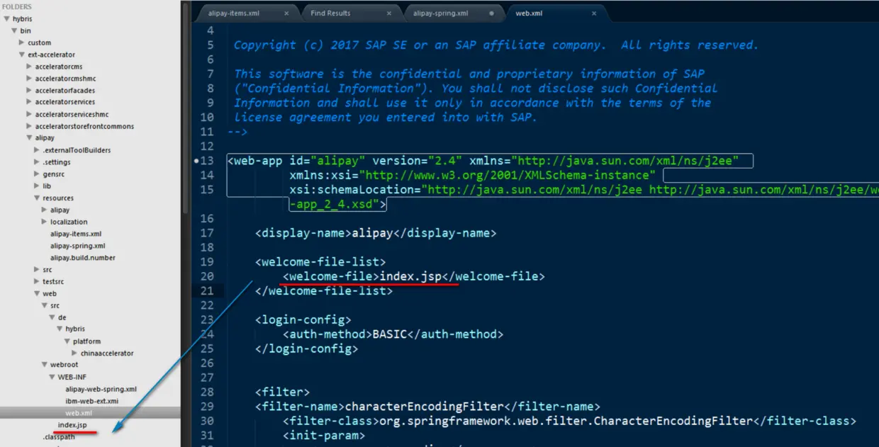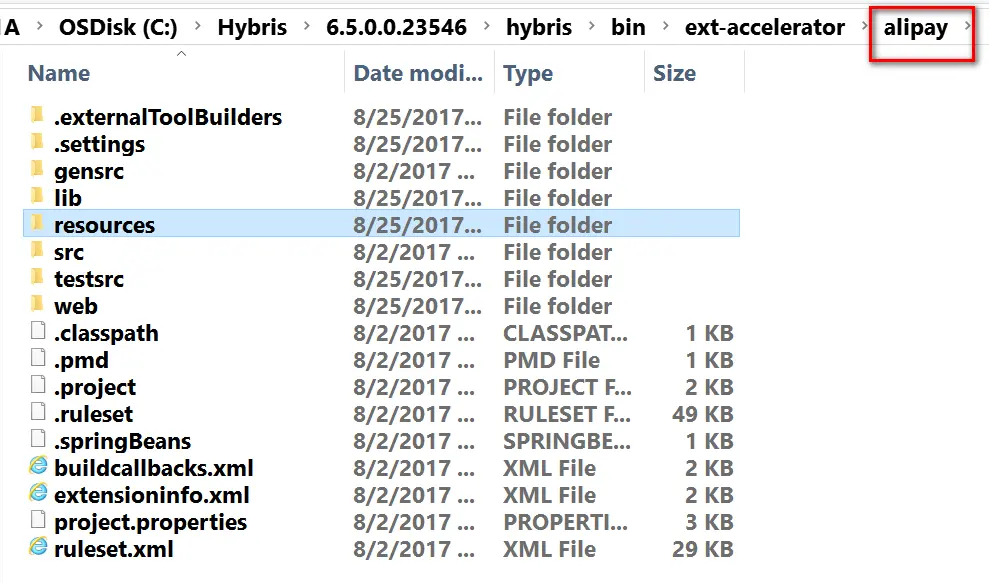 An extension can contain business logic, type definitions, a web application, or a Hybris Management Console configuration. That way, you link up in one place all of the functionality that covers a certain field of use, for example a webshop. 这个概念和ABAP里的package非常类似。 比如这个alipay是成都团队开发的一个extension: