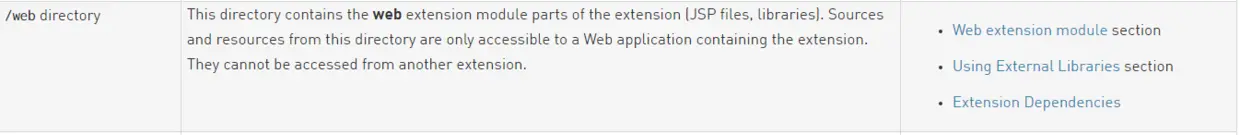 Hybris的extension里的大多数folder下的object,访问控制的behavior和ABAP package一致。除了/web folder下的UI实现:This directory contains the web extension module parts of the extension (JSP files, libraries). Sources and resources from this directory are only accessible to a Web application containing the extension. They cannot be accessed from another extension.