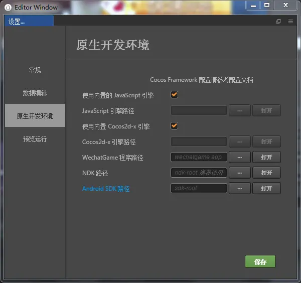 - Android SDK 路径,选择刚才在 SDK Manager 中记下的 Android SDK Location 路径(Android SDK 的目录下应该包含 build-tools、platforms 等文件夹),不需要编译 Android 平台的话这里可以跳过。