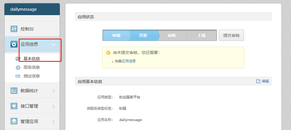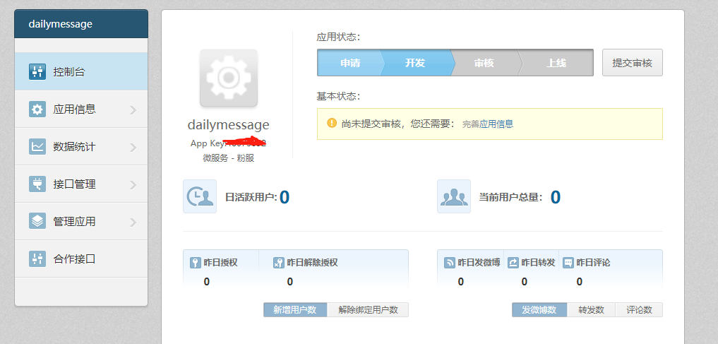 当然在使用这个平台之前,我们还是要先注册并创建好应用。比如像我这样,创建好一个应用