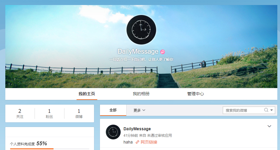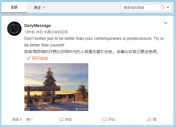 我们运行该代码,如果不出意外的话,我们就能够在该账号下的微博中看到刚刚发布的微博了。