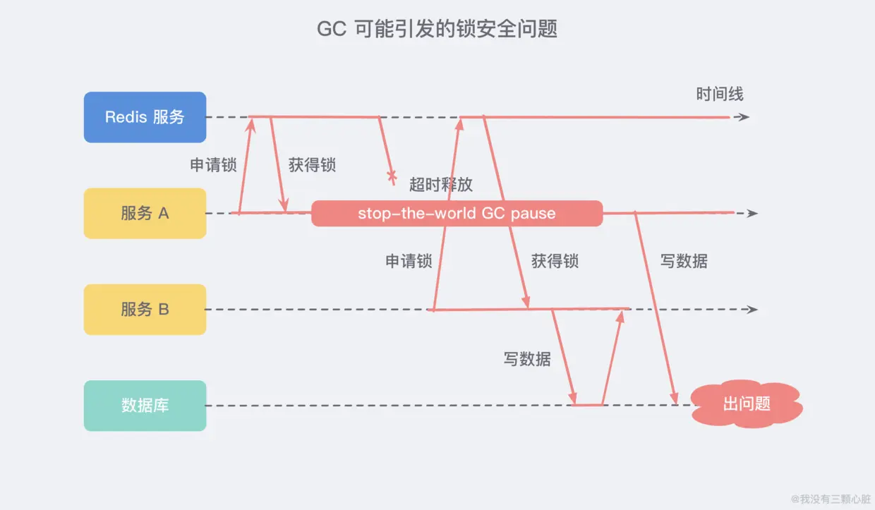 服务 A 获取了锁并设置了超时时间,但是服务 A 出现了 STW 且时间较长,导致了分布式锁进行了超时释放,在这个期间服务 B 获取到了锁,待服务 A STW 结束之后又恢复了锁,这就导致了 服务 A 和服务 B 同时获取到了锁,这个时候分布式锁就不安全了。