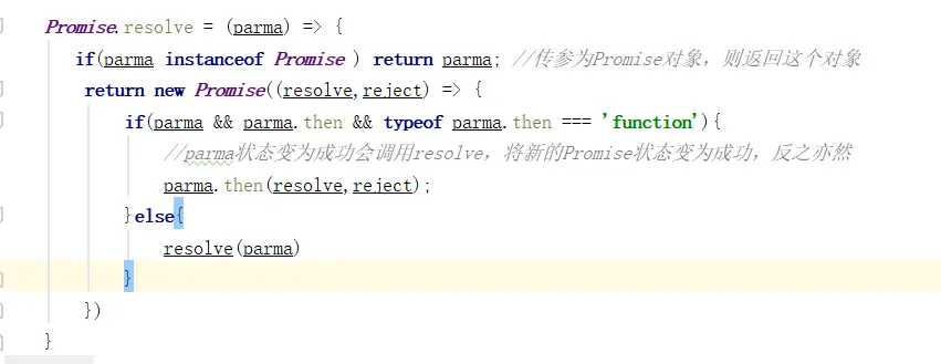 - 传参为一个thenable对象,返回的Promise会跟随这个对象,将他的最终状态作为自己的对象;