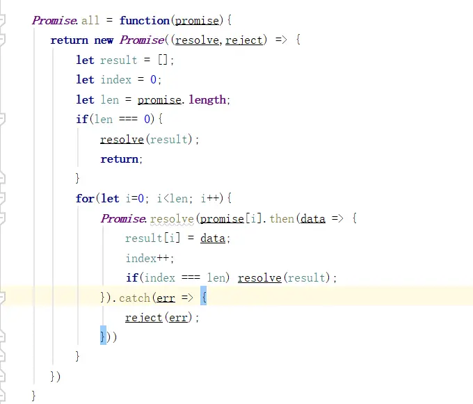 - 如果传参中有一个promise失败,那么Promise.all返回的promise对象失败;