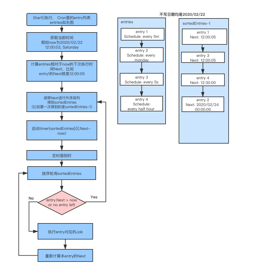 - 先对entries按下次执行时间升序排序,只需要对第一个entry启动定时器