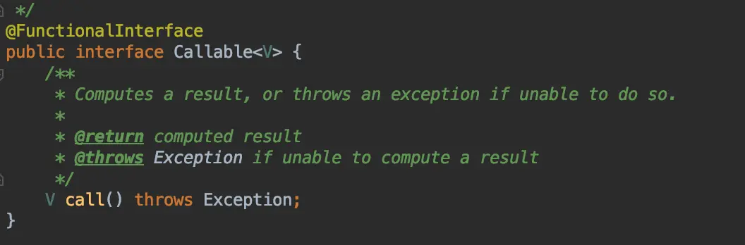 - V get() :获取Callable接口中call()方法的返回值,调用该方法会导致线程阻塞,一直到子线程结束;