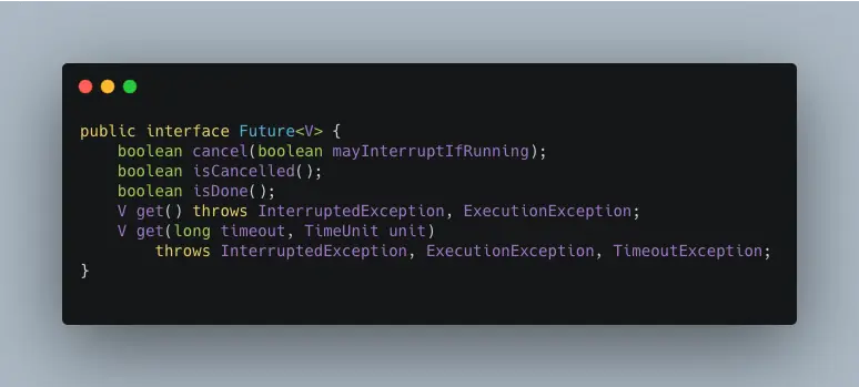 Future就是对于具体的Runnable或者Callable任务的执行结果进行取消、查询是否完成、获取结果。必要时可以通过get方法获取执行结果,该方法会阻塞直到任务返回结果,我们看下Future接口中的方法: