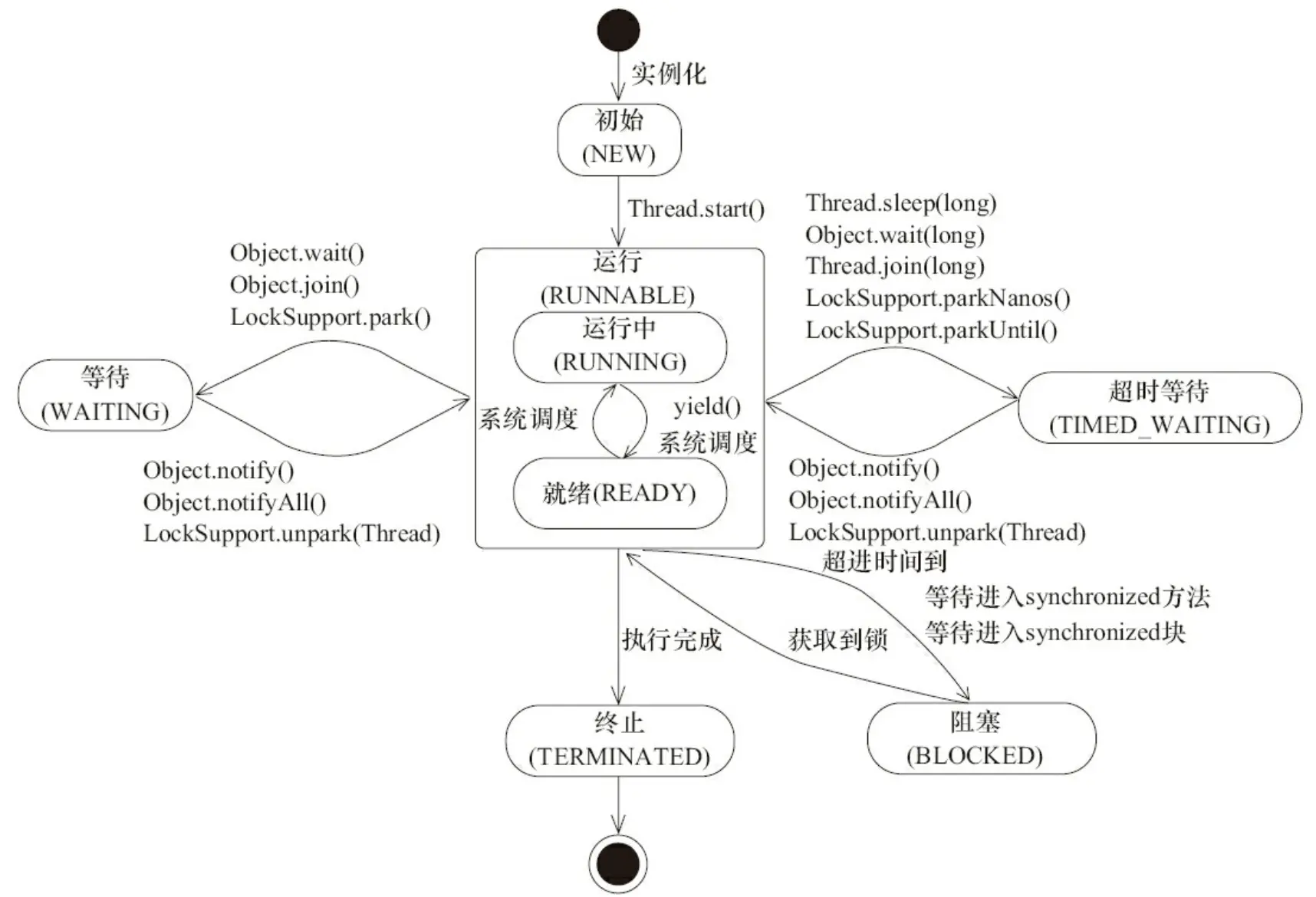 java.lang.IllegalThreadStateException异常,即处于终止状态的对象不能再使用。 - RUNNABLE可运行/运行状态 <-> BLOCKED阻塞状态: 这个状态,一般是线程,比如线程A,在等待获取一个锁,这个锁被其他线程占有,线程A在等待获取锁的过程中的状态就是BLOCKED阻塞状态。在Java中,当线程等待获取synchronized的隐式锁的时候,由于synchronized修饰的方法、代码块同一时刻只能允许一个线程进入,其他线程只能在外等待,这种情况就会触发这个状态转换;当持有锁的线程释放锁,等待线程获得synchronized锁,状态就会从BLOCKED转换为可运行状态;