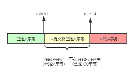 read view取的是所有当前活跃的事务 ID 数组,活跃指的是,已开启并生成事务 ID 但未提交的事务。max id取的是,目前为止,最大的事务 ID,不论是否已提交。我们还称read view数组中,最小的值为min id。 -