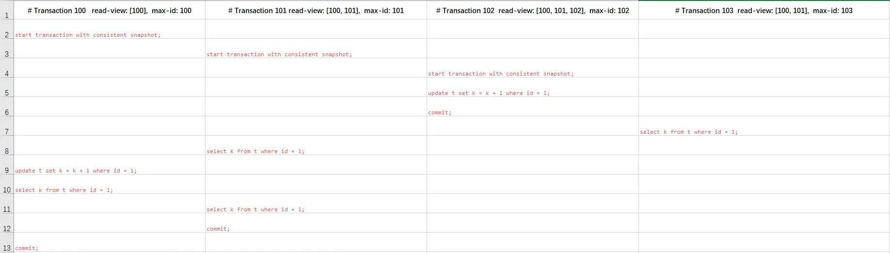 read view及max id,要注意的是,这里我并没有使用begin/start transaction来开启事务,是因为它们并不会马上创建read view及max id,而是在执行第一条select语句后,来进行创建的。 -