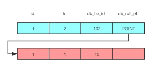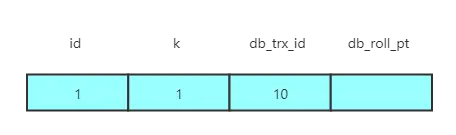 对于数据库的每行记录,都会有三个隐藏字段:db_trx_id (事务 id)、db_roll_pt (回滚指针)、delete_flag(删除标记)。— 有懂的朋友,还望别细纠,其实 delete_flag 是在头信息中,这里是为了方便理解