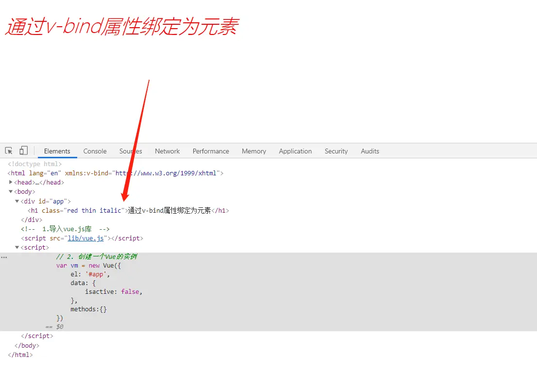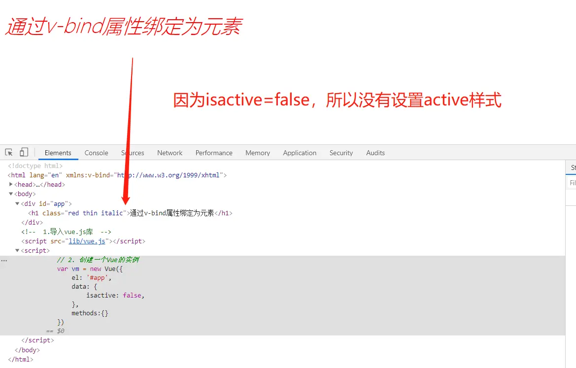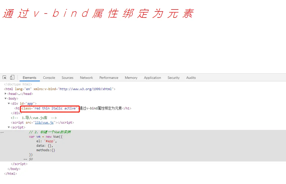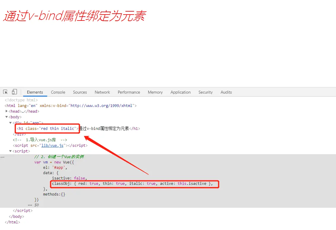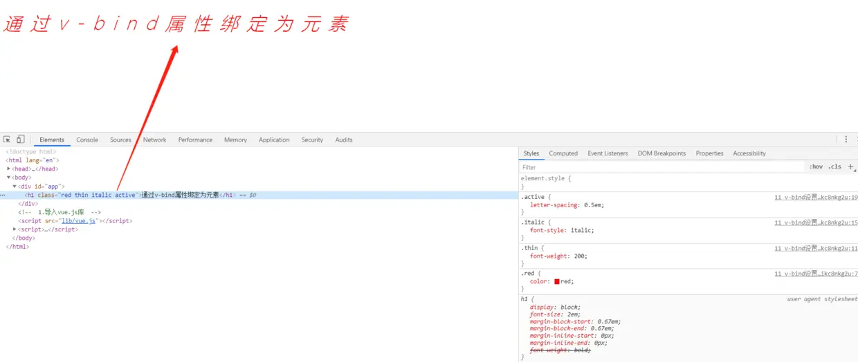 <h1 class="red thin italic active">通过v-bind属性绑定为元素</h1>