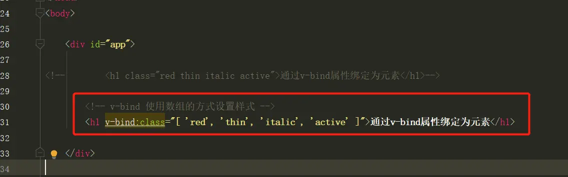 <h1 :class="{red:true, italic:true, active:true, thin:true}">通过v-bind属性绑定为元素</h1>