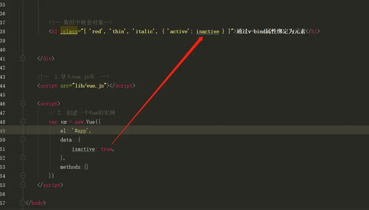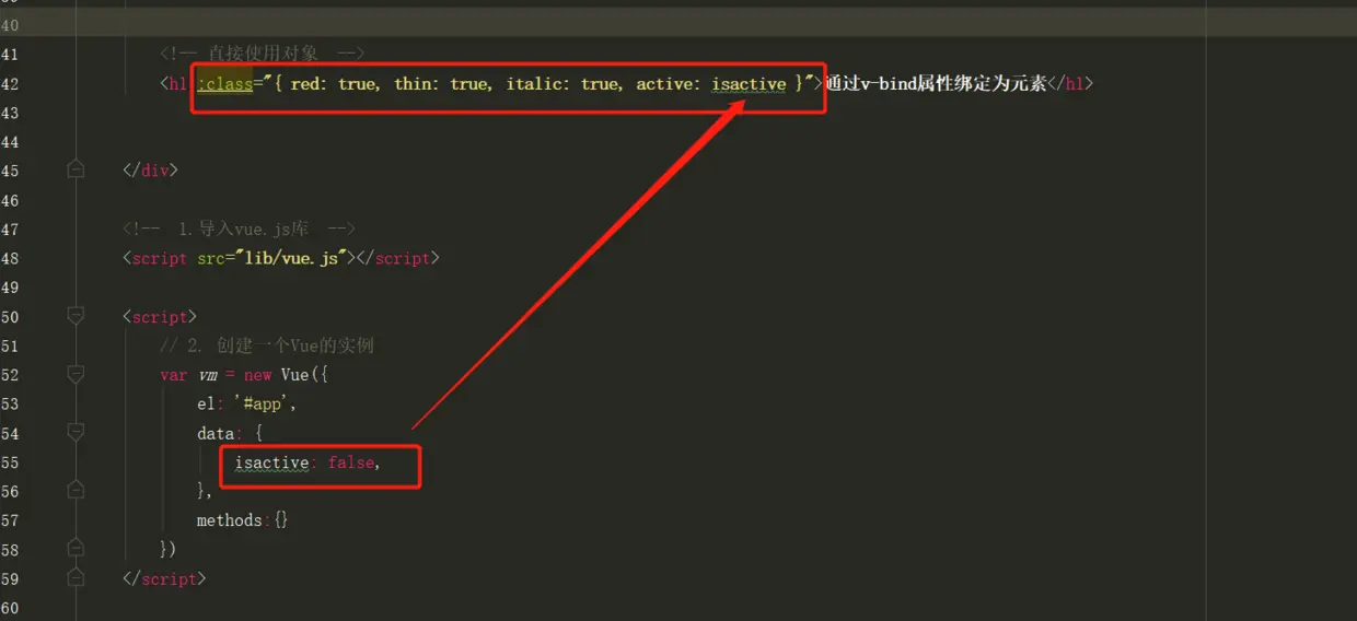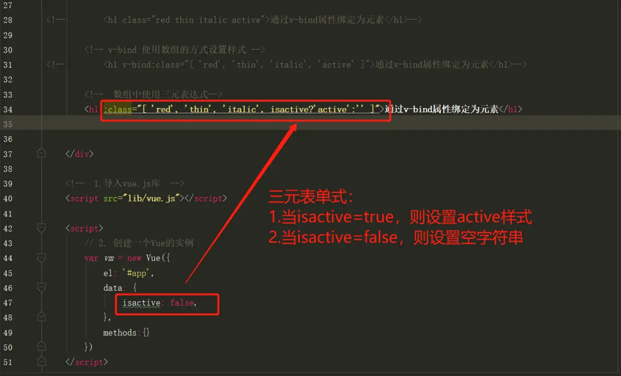 <h1 :class="['red', 'thin', isactive?'active':'']">通过v-bind属性绑定为元素</h1>