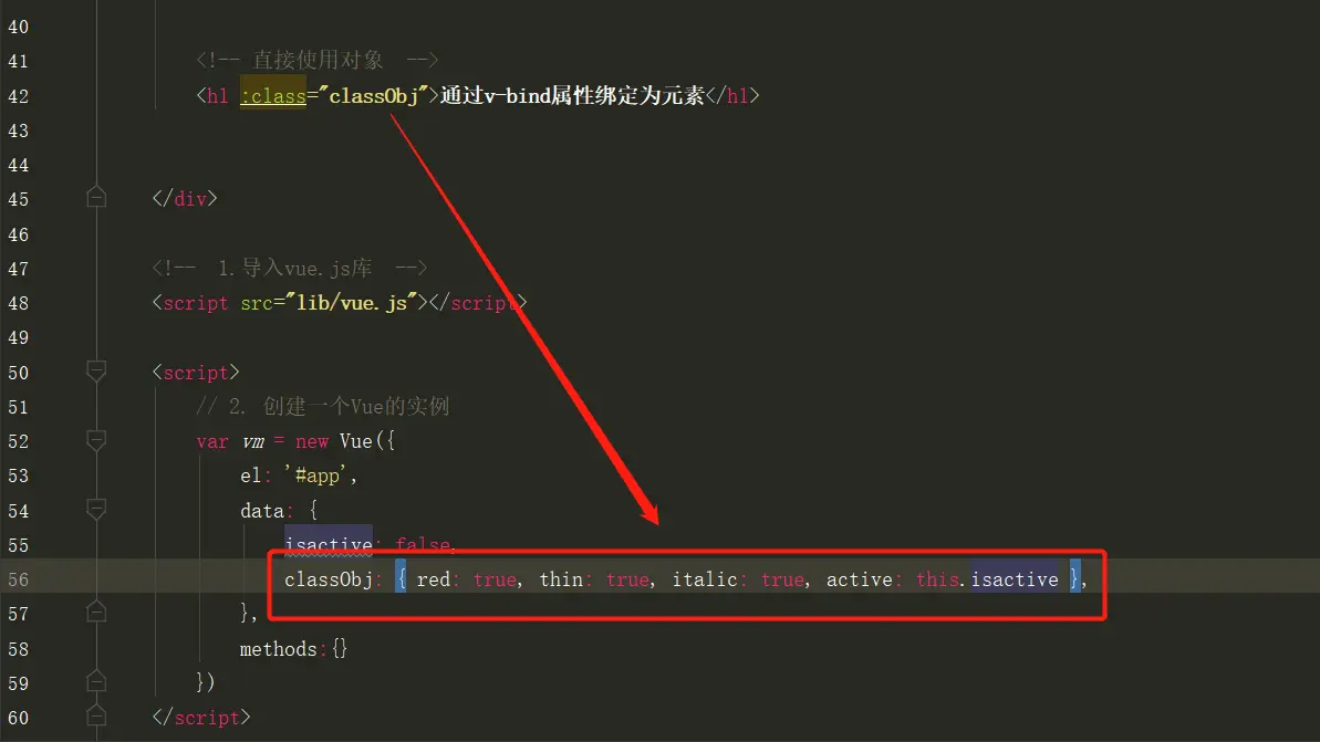 <h1 :class="['red', 'thin', {'active': isactive}]">通过v-bind属性绑定为元素</h1>