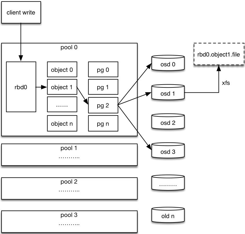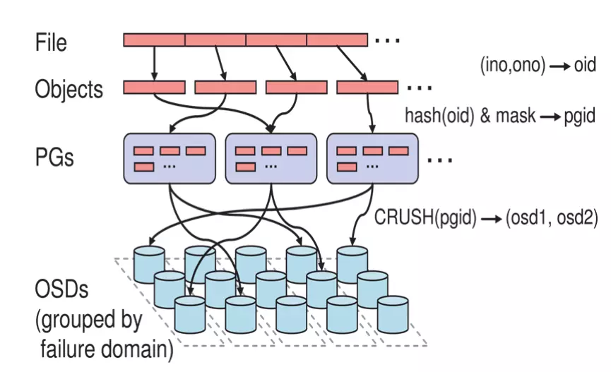 Ceph最底层的存储单元是Object对象,每个Object包含元数据和原始数据。