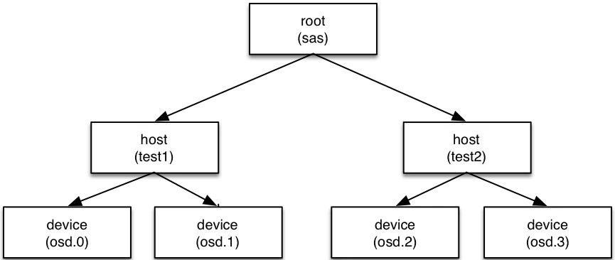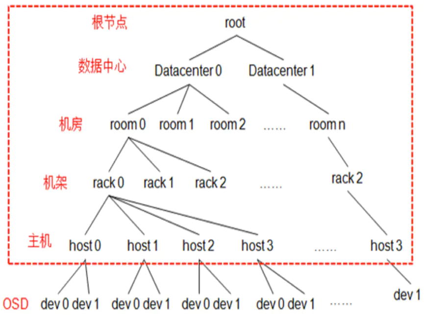 叶子节点是device(也就是osd),其他的节点称为bucket节点,这些bucket都是虚构的节点,可以根据物理结构进行抽象,当然树形结构只有一个最终的根节点称之为root节点,中间虚拟的bucket节点可以是数据中心抽象、机房抽象、机架抽象、主机抽象等。