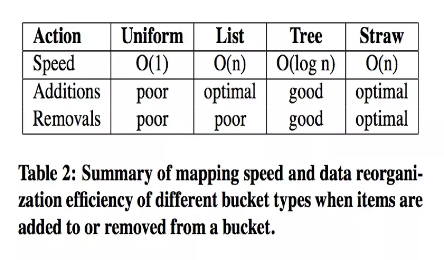 list buckets:适用于集群扩展类型。增加item,产生最优的数据移动,查找item,时间复杂度O(n)。