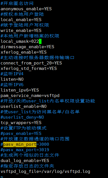 vi vsftpd.conf (该文件为FTP服务器的主配置文件,注意每一行结尾一定不能有空格)