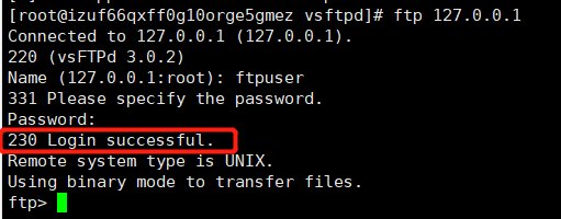 当出现230,便表示服务器端的FTP已经配置完成了