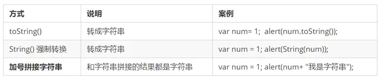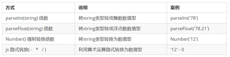 使用表单、prompt 获取过来的数据默认是字符串类型的,此时就不能直接简单的进行加法运算,而需要转换变量的数据类型。通俗来说,就是把一种数据类型的变量转换成另一种数据类型,通常会实现3种方式的转换: