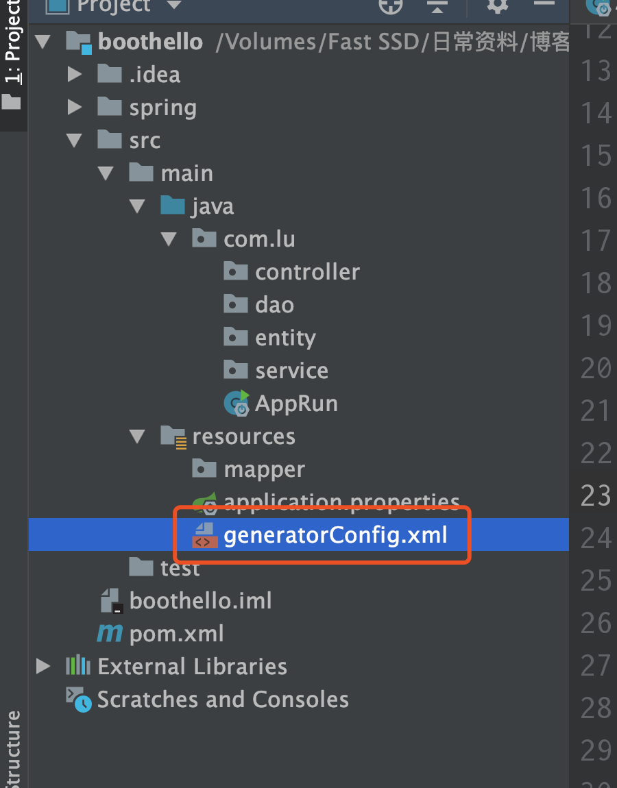 导入依赖之后,需要在SpringBoot resources目录下导入 MBG 的配置文件 generatorConfig.xml