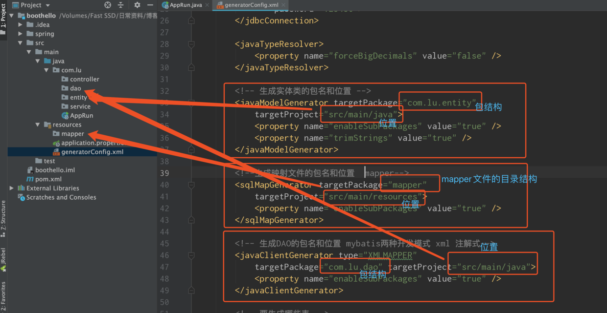 dao接口 实体类 mapper文件生成位置 包结构的配置