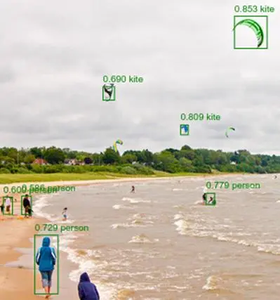 图5.16来自TensorFlow.js版本的单点检测(SSD)模型的示例对象检测结果。请注意多个边界框及其关联的对象类和置信度分数。