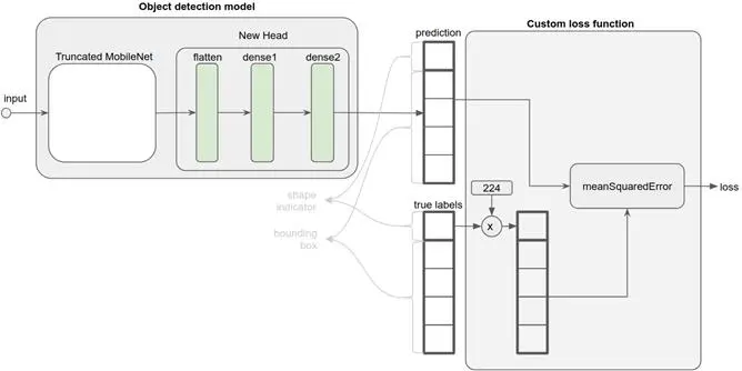 “双重任务”模型的关键部分由清单5.9中的buildNewHead()方法构建。模型示意图如图5.15左侧所示。新的头部由三层组成:一个扁平层,它重置了截断的MobileNet原始模型最后一个卷积层的输出的形状,以便以后可以添加致密层。第一致密层是一个具有relu非线性的隐层。第二致密层是头部的最终输出,因此是整个目标检测模型的最终输出。此层具有默认的线性激活。这是理解该模型如何工作的关键,因此需要仔细研究。